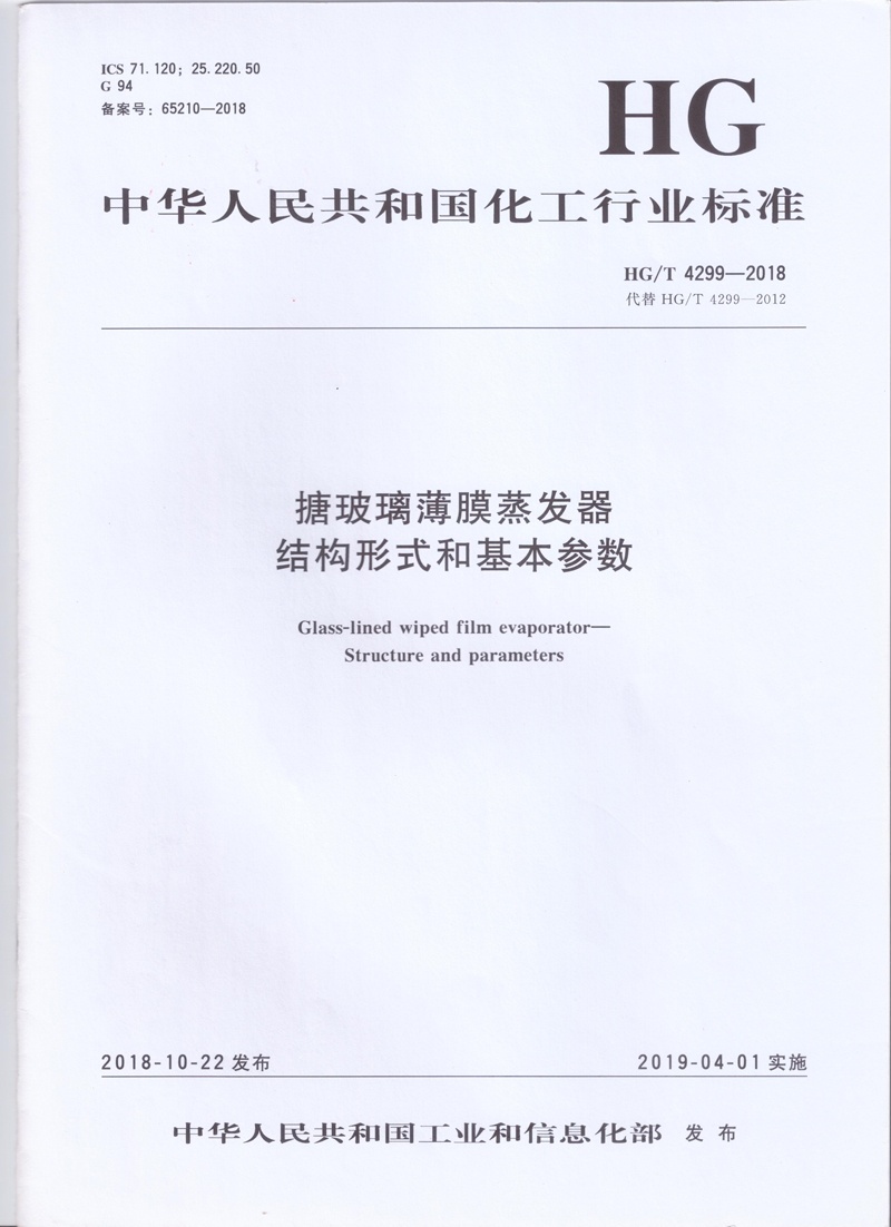 HG/T 4299-2018搪玻璃薄膜蒸發(fā)器結(jié)構(gòu)形式和基本參數(shù)