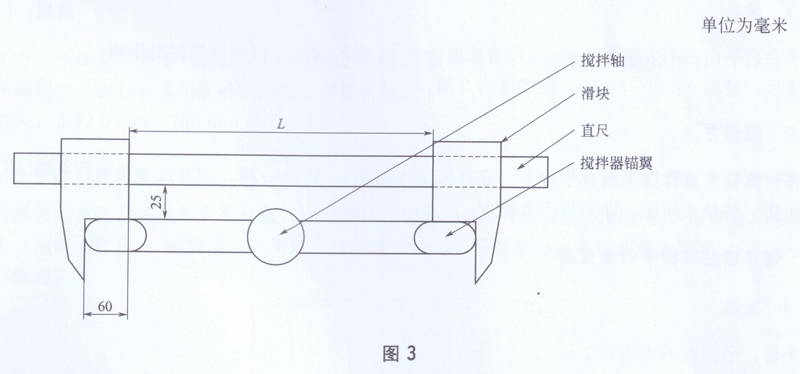 將待測攪拌器放平,如圖3所示,將直尺的兩個滑塊卡在攪拌器的兩個錨翼上,在直尺上讀出滑塊兩端的長度L,則攪拌器錨翼寬度值為L+120 mm,取3次測量的平均值與攪拌器標準寬度之差的絕對值作為攪拌器錨翼寬度與標準寬度的偏差。