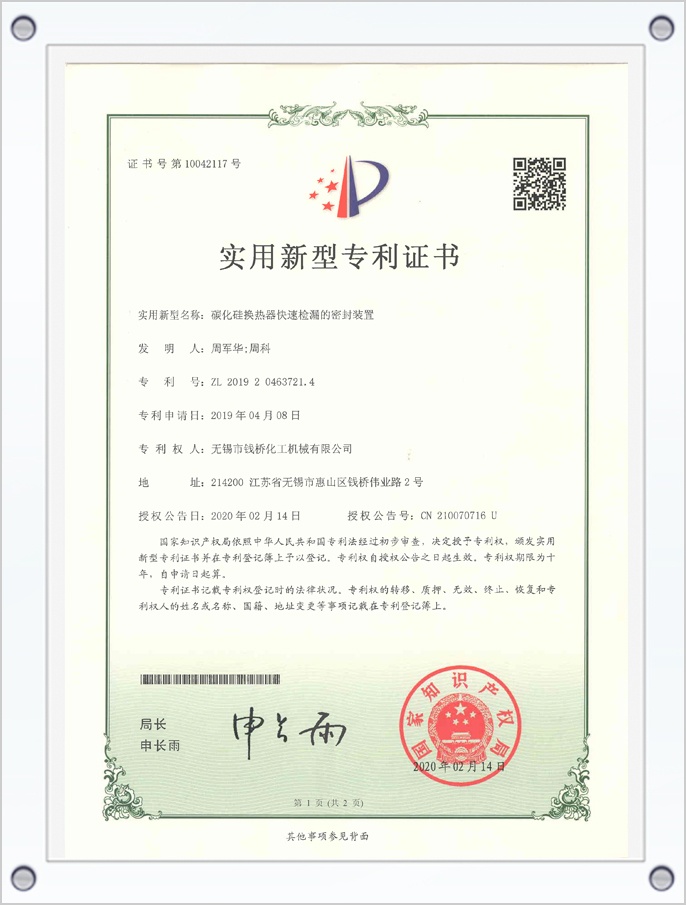 碳化硅換熱器快速檢漏的密封裝置專利證書