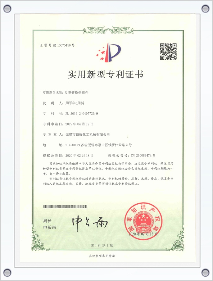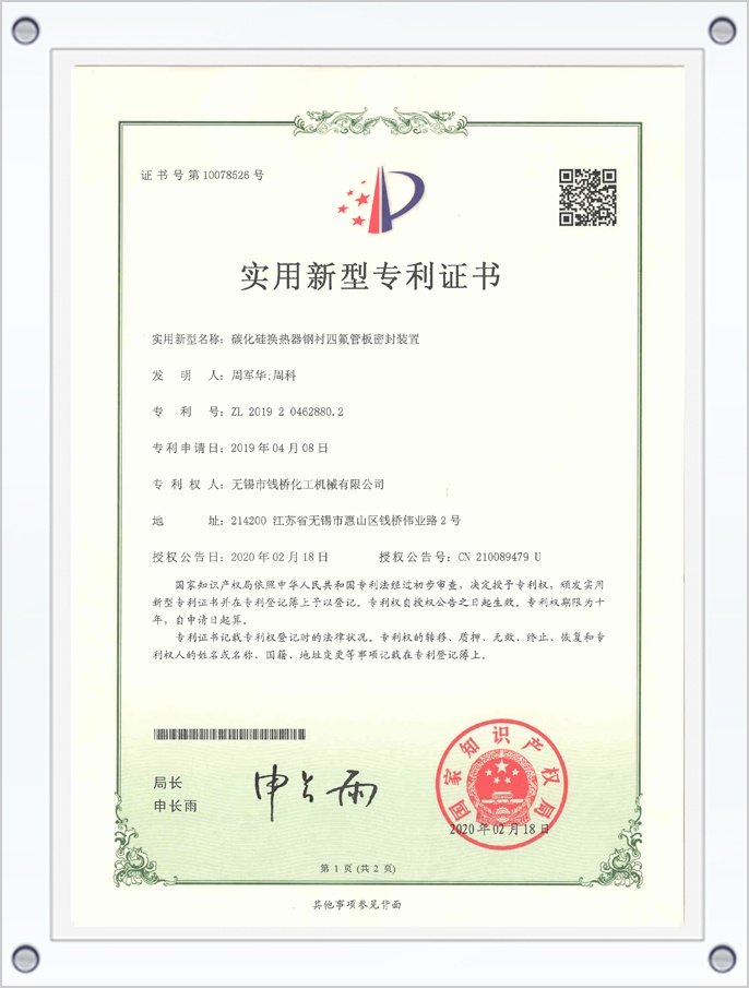 搪瓷管板型碳化硅化熱器專利證書(shū)