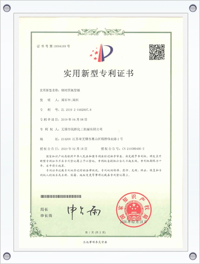 碳化硅換熱器鋼襯四氟管板密封裝置專利證書(shū)