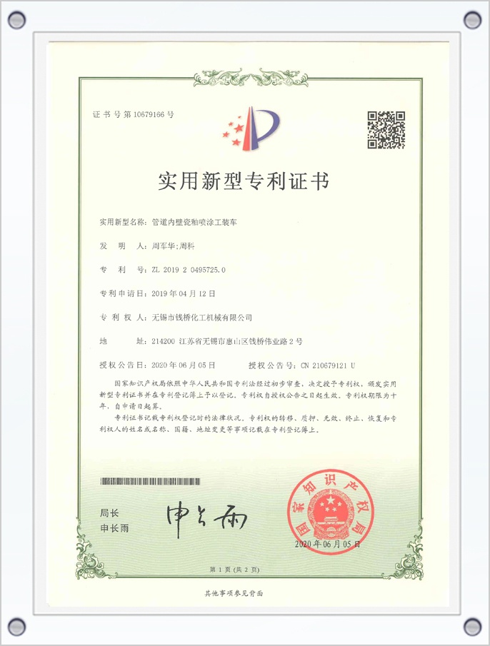管道內(nèi)壁瓷釉噴涂工裝車專利證書(shū)
