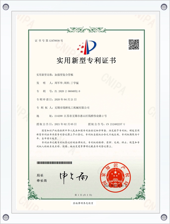 加強(qiáng)型復(fù)合管板專利證書(shū)