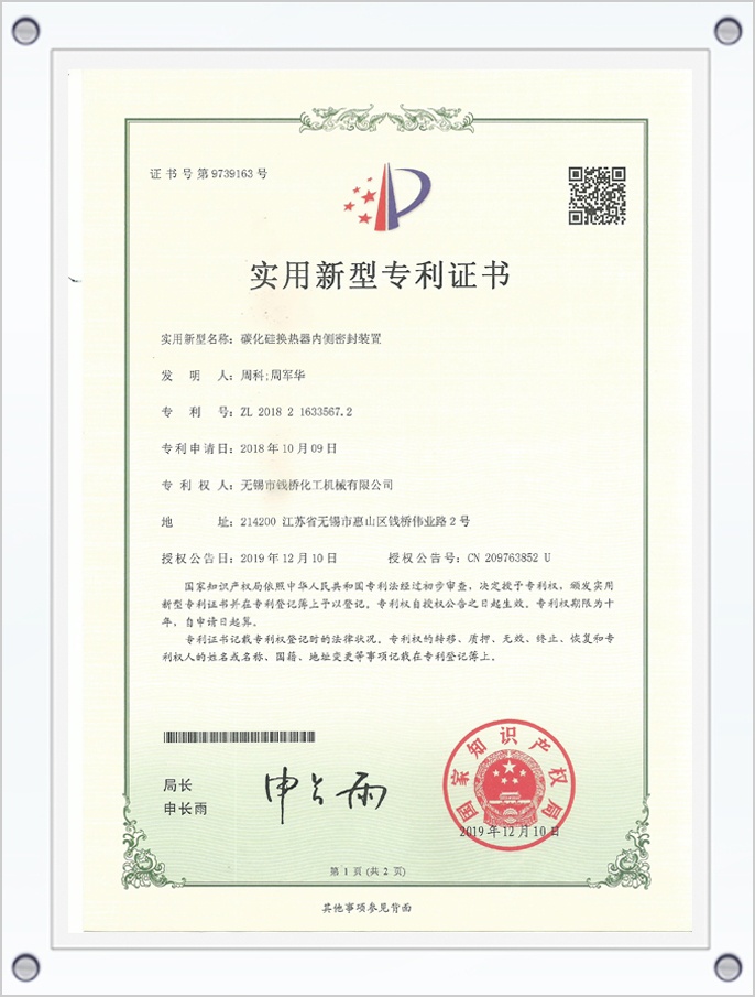 碳化硅換熱器外側(cè)密封裝置專利證書(shū)
