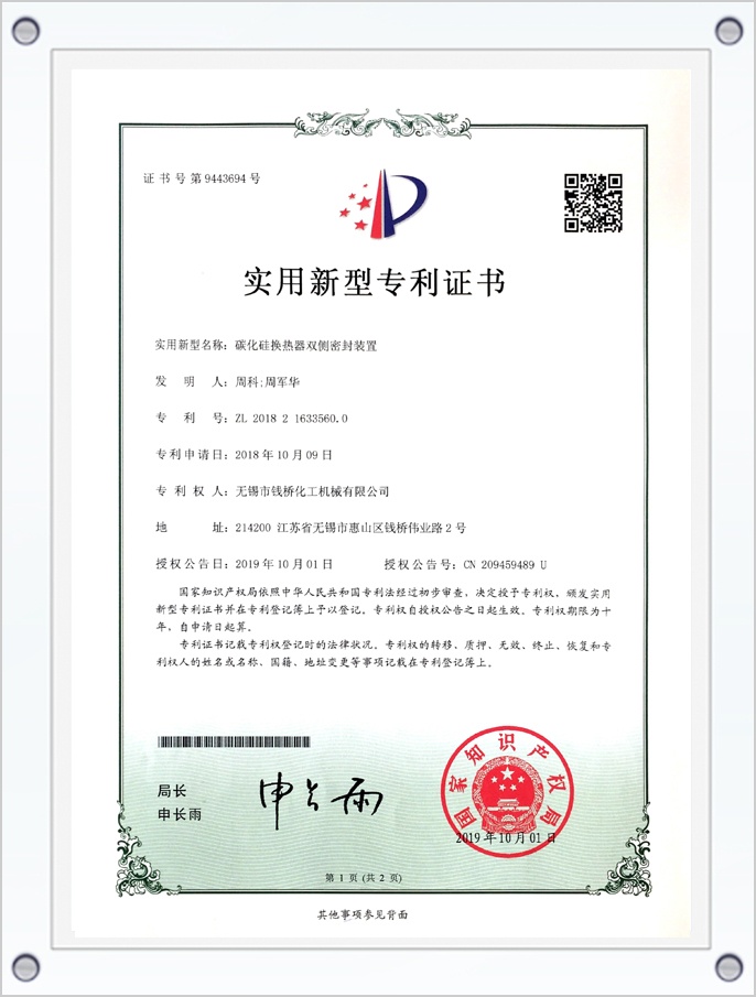 碳化硅換熱器雙側(cè)密封裝置專利證書(shū)