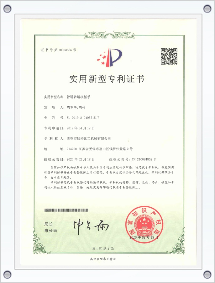 管道轉(zhuǎn)運(yùn)機(jī)械手專利證書(shū)