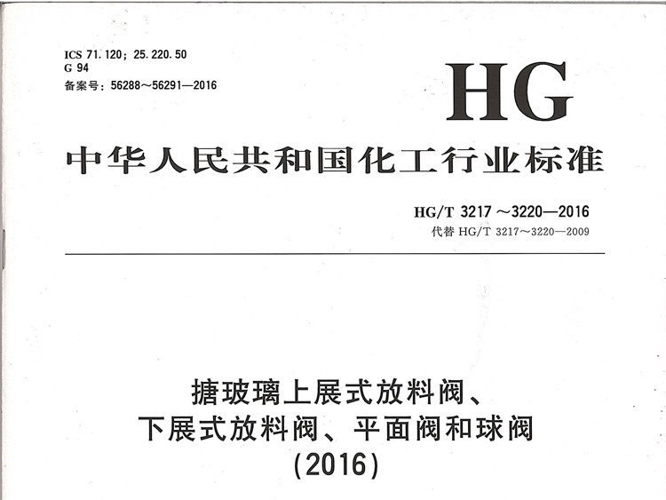 中華人民共和國化工行業(yè)標(biāo)準(zhǔn)之HG/T3217~3220-2016搪玻璃上展式放料閥、下展式放料閥、平面閥和球閥(2016),無錫市錢橋化工機械有限公司為本標(biāo)準(zhǔn)起草單位之一。 ...